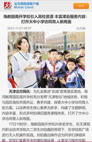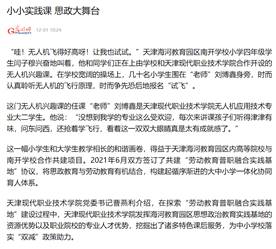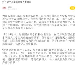 智能工程学院与天津海河教育园区南开学校签署了共建“劳动教育普职融合实践基地”协议,共同探索大中小学一体化劳动教育新模式。无人机专业优秀学生代表在专业教师的指导下,自2021年3月起,每周三下午前往南开学校开展三年级至五年级《航空智能科技实验室》以及《航空器制作与控制》两门素拓课程。通过参加素拓课程,极大提高了小学生对航空航天的热爱,增强了动手能力,对飞行安全、空气动力学、飞行器构造、数据链路等相关知识有了初步了解。截止目前,智能工程学院共承担了南开学校昭惠路校区拓展课程2门、雅润路校区拓展课程1门,得到了学校及家长的充分认可。协同开展特色劳动教育,让中小学生充分进行了劳动体验,也让学院学生学有所展、发挥所长,极大地提升了学生的职业意识和职业自信。劳动育人活动在今晚报、北方网、中国日报网、光明网、国际在线等11家媒体相继报道。