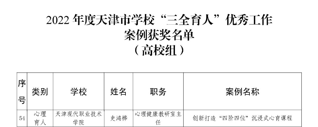 日前,市委教育工委、市教委公布了2022年度天津市学校“三全育人”优秀工作案例获奖名单。金年会学生处心理健康教研室主任史鸿桦带领团队成员编写的心理育人案例——《创新打造“四阶四位”沉浸式心育课程》获评天津市学校“三全育人”高校组优秀工作案例。