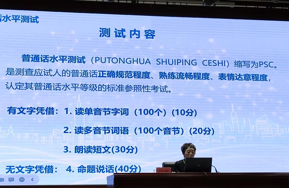 首先,叶红梅从“关于普通话”“普通话与我”“讲好普通话”与“普通话语言艺术”四大部分,带领大家简要地回顾了普通话含义,包括普通话的制定历史、普通话的定义、普通话的特点等。