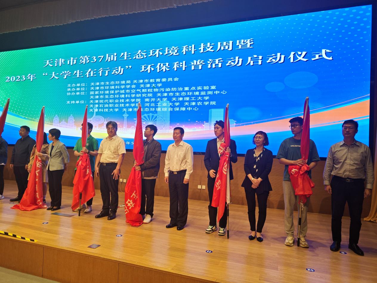 启动仪式临近结束时,各校学生代表上台接受授旗,最后,张弢宣布,天津市第37届生态环境科技周暨2023年“大学生在行动”活动正式启动。