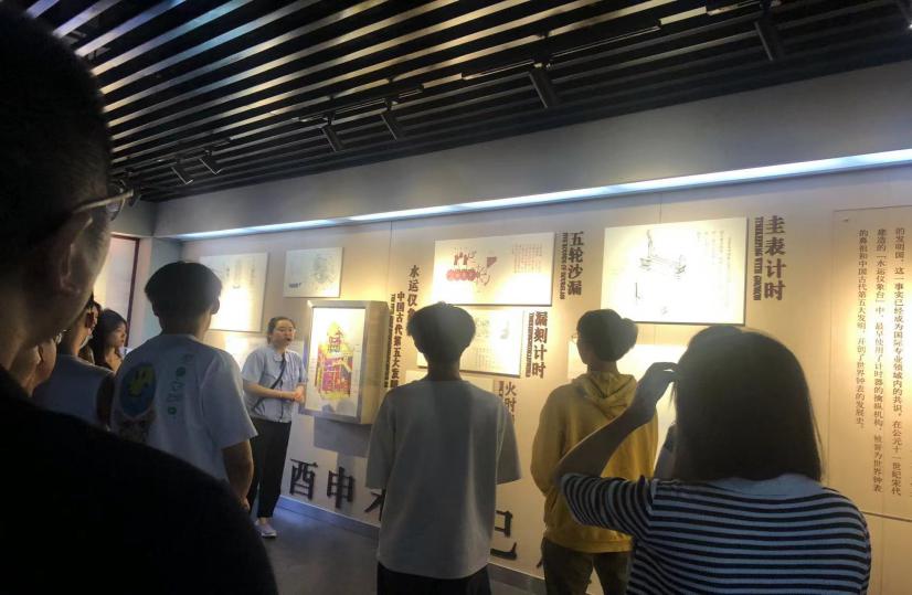 研学第一站,太阳投影钟。太阳投影钟直径19米,由三种颜色的花岗岩组成,周边镶嵌十二属相铜雕,极具中国特色。由GPS定位投影坐标,按农历二十四节气,划出刻度,以人体的太阳投影为指针,算出当地时间,误差极小。在工作人员的指引下,同学们纷纷尝试计算,都被其中的中华传统技艺所折服。
