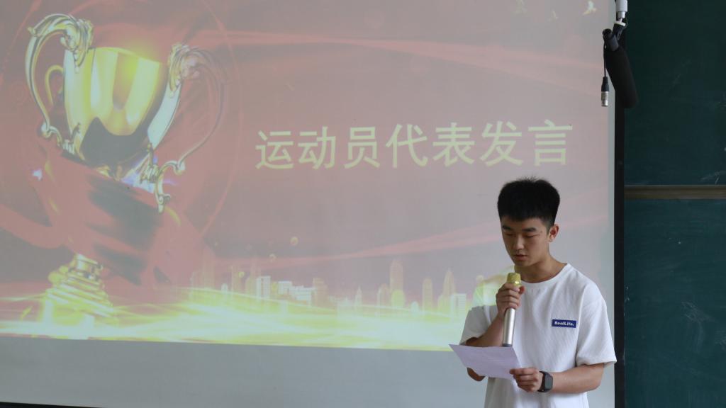 校运会4*100米冠军队员、100米决赛季军,光伏G22-2班蒋日展同学代表获奖个人上台发言。他感谢学校和机电工程学院能够给予自己这次展现能力的平台,此次运动会优异成绩的获得离不开师生的共同努力。他表示体育与生活息息相关,体育精神同样适用于日常学习生活,呼吁全体学生将体育精神和自己的人生目标相结,如海燕搏击风浪、如雄鹰展翅高飞、如大鹏扶摇直上,走好自己的人生路。