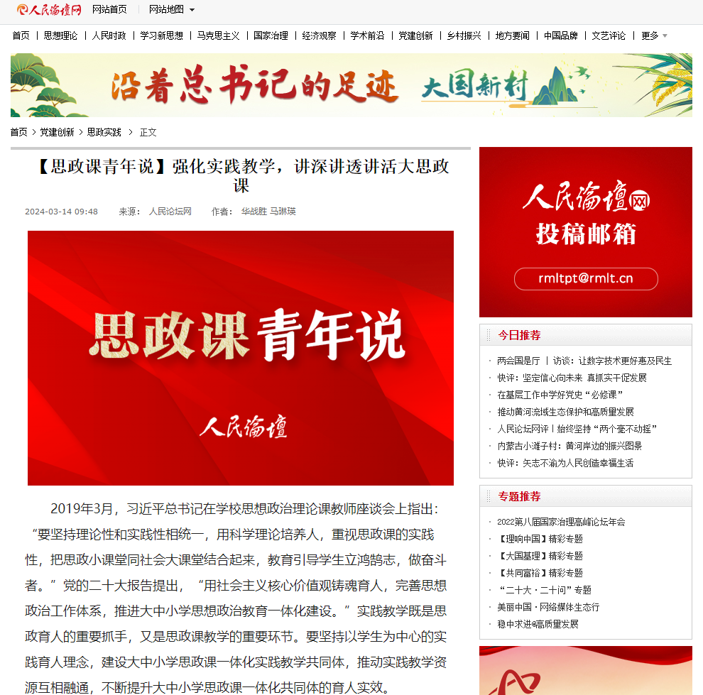 实践教学实现了思政课由教师主导到学生主体、由课堂空间到社会空间、由理论知识到实践生活的拓展,是提升思政课教学质量和实效的重要途径,也是推动大中小学思政课一体化共同体建设的重要抓手。要不断推进思政课实践教学改革,形成实践育人的长效机制,激励各学段学生用脚步丈量祖国大地,用眼睛发现中国精神,用耳朵倾听人民呼声,用内心感应时代脉搏,努力成长为堪当民族复兴重任的时代新人。(作者:金年会jinnianhuicom马克思主义学院院长 华战胜,金年会jinnianhuicom马克思主义学院教师 马琳瑛)