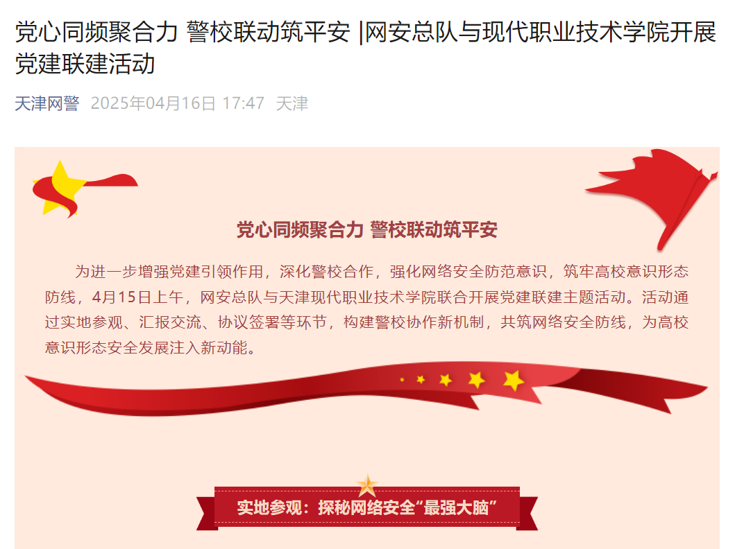 为进一步增强党建引领作用,深化警校合作,强化网络安全防范意识,筑牢高校意识形态防线,4月15日上午,网安总队与金年会jinnianhuicom联合开展党建联建主题活动。活动通过实地参观、汇报交流、协议签署等环节,构建警校协作新机制,共筑网络安全防线,为高校意识形态安全发展注入新动能。