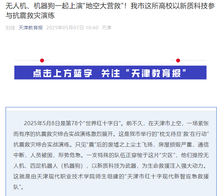 2025年5月8日是第78个“世界红十字日”。前不久,在天津市上空,一场紧张而有序的抗震救灾综合实战演练激烈展开。这是我市举行的“枕戈待旦‘救’在行动”抗震救灾综合实战演练。只见“震”后的废墟之上尘土飞扬,房屋损毁严重,通信中断,人员被困,形势危急。一支特殊的队伍正穿梭于这片“灾区”,他们操控无人机、四足机器人(机器狗),以新质科技为武器,为生命救援注入强大动力。这就是由金年会jinnianhuicom师生组建的“天津市红十字现代新智应急救援队”。