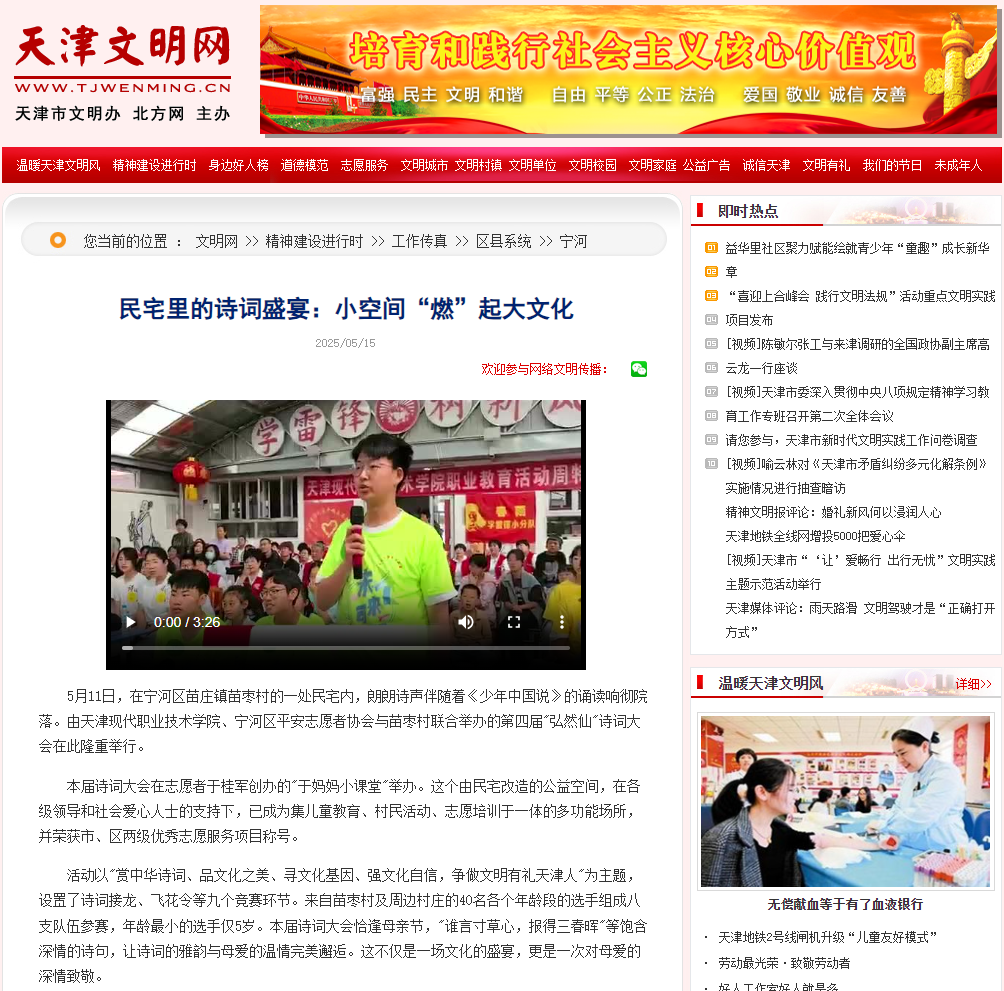 5月11日,在宁河区苗庄镇苗枣村的一处民宅内,朗朗诗声伴随着《少年中国说》的诵读响彻院落。由金年会jinnianhuicom、宁河区平安志愿者协会与苗枣村联合举办的第四届"弘然仙"诗词大会在此隆重举行。
