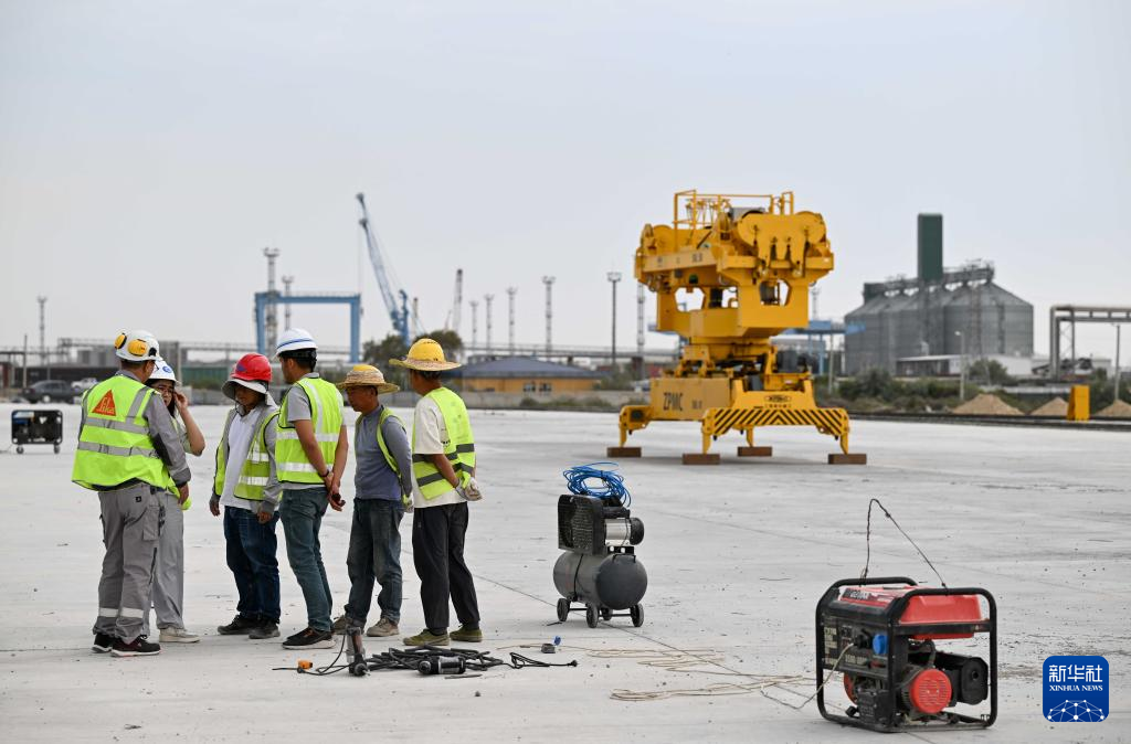 8月5日,工人在哈萨克斯坦阿克套港集装箱枢纽一期工程工作。新华社记者 李任滋 摄