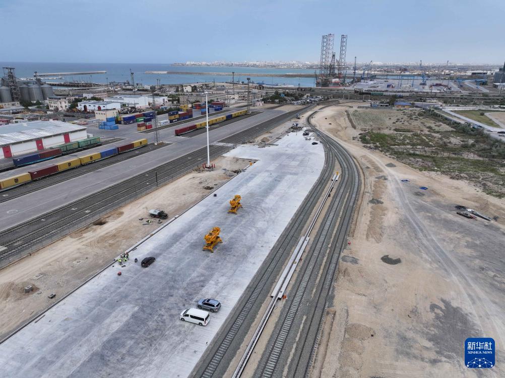 这是8月5日在哈萨克斯坦阿克套港拍摄的阿克套港集装箱枢纽一期工程建设场景(无人机照片)。新华社记者 李任滋 摄