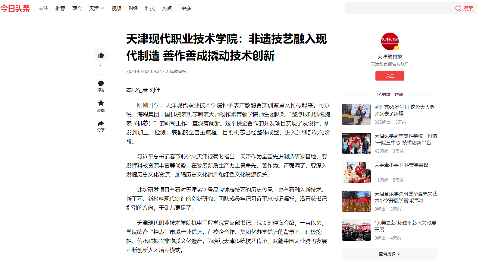 金年会jinnianhuicom机电工程学院党支部书记、院长刘仲海介绍,一直以来,学院结合“钟表”市域产业优势,在校企合作、集团化办学优势的背景下,积极挖掘、传承和振兴非物质文化遗产,为赓续天津传统技艺传承、赋能中国表业腾飞发展不断创新人才培养模式。