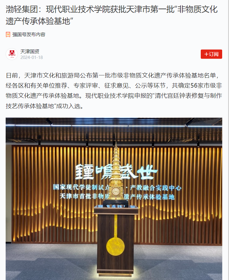 日前,天津市文化和旅游局公布第一批市级非物质文化遗产传承体验基地名单,经各区和有关单位推荐、专家评审、征求意见、公示等环节,共确定56家市级非物质文化遗产传承体验基地。现代职业技术学院申报的“清代宫廷钟表修复与制作技艺传承体验基地”成功入选。